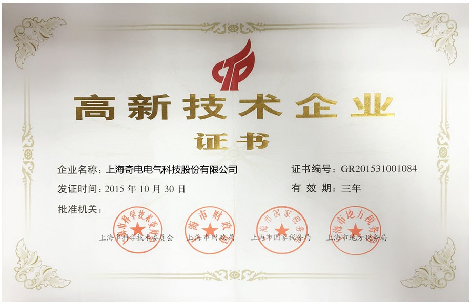 热烈庆祝上海PA视讯平台电气科技股份有限公司荣获由上海市科技部、上海市财政部、上海市国家税务总局和上海市地方税务局联合颁发的高新技术企业证书。